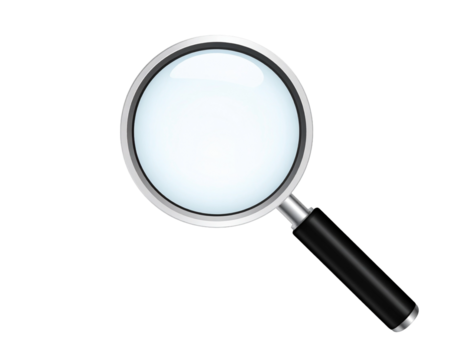 Magnifying glass with black handle and silver rim on a white circular shape isolated on a transparent background