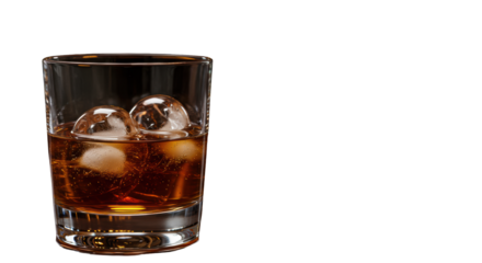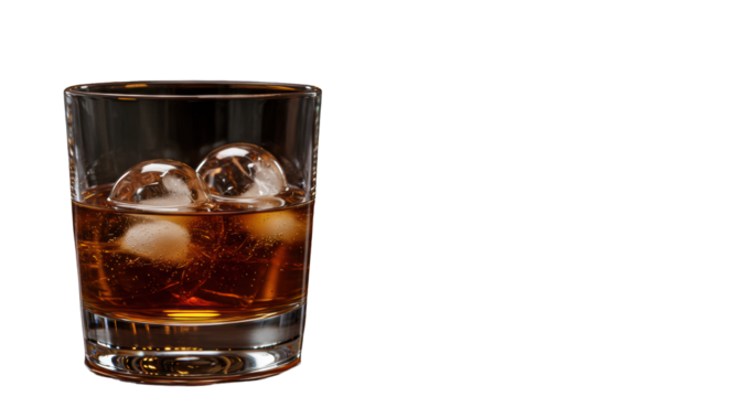 Elegant crystal tumbler with deep amber whiskey, spherical ice, condensation, on polished mahogany, blurred upscale lounge bokeh background, concept of sophisticated indulgence