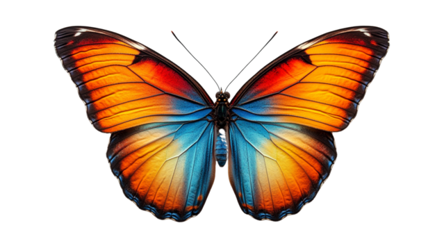 A butterfly with orange and black wings. The butterfly is resting on a white background. The butterfly is the main focus of the image
