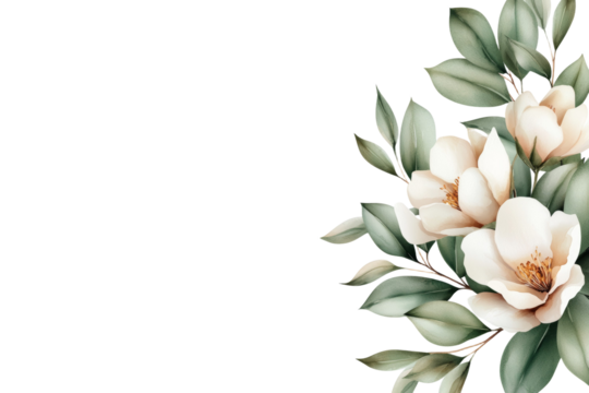 White flower with green leaves is the main focus of the image, isolated
