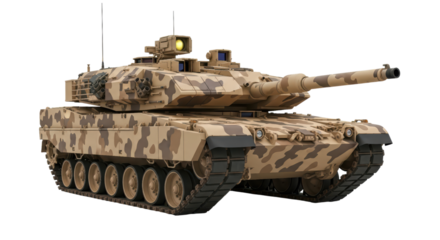 Tan camouflage main battle tank with gun turret on transparent background