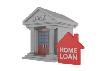 A 3D rendering of a bank building alongside a red house icon with 'HOME LOAN' text, representing financial services for home ownership. background removed