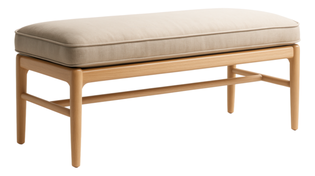 A streamlined bench with a simple wooden frame and a neutral-toned cushion, ideal for a minimalist apartment bedroom to maintain a clutter-free look.