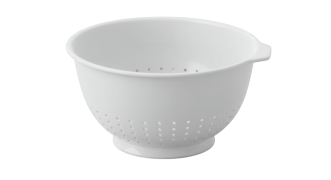 White plastic colander with holes for draining pasta and vegetables