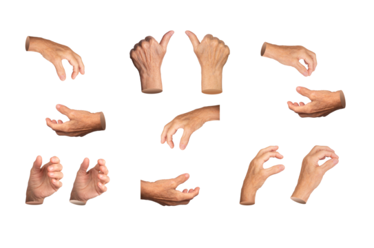 Set of elderly female hands in various grasping and holding gestures, including pinching, gripping, and offering. Wrinkled fingers emphasizing age and expression. Isolated on white background.