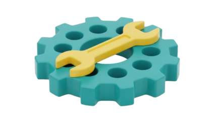 Isolated gearwheel with yellow wrench represents setting options and configuration, tools, repair