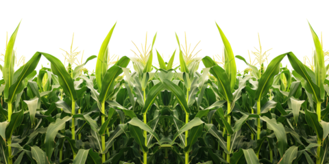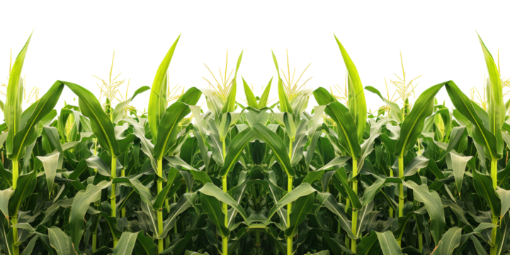 Lush green cornfield with rows of tall maize plants in summer, cut out - stock png.