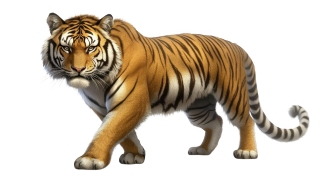 A tiger majestically walking across dark, black background, showcasing its powerful and elegant stride.
