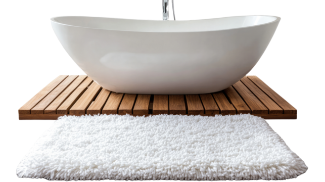 Luxurious Bathroom Oasis:  A pristine white bathtub sits majestically on a warm wooden platform, inviting relaxation and rejuvenation. The soft, plush rug adds a touch of elegance to the scene.