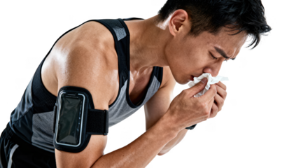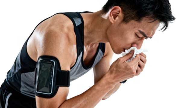 Athlete wearing sports armband stops running outdoors struggling with l congestion using tissue to clear nose while catching breath after intense exercise.