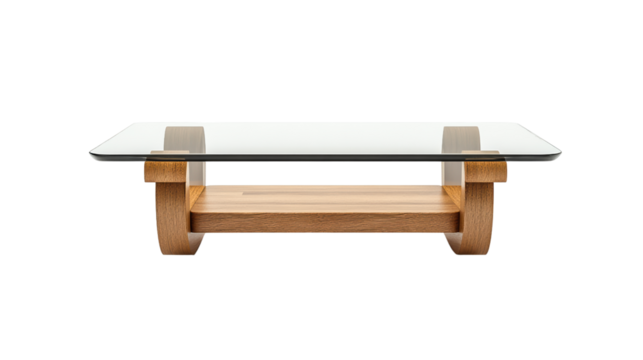 A modern, stylish coffee table with a clear glass top and a sturdy wooden base. The table's sleek design and neutral colors would complement a variety of interior design styles.