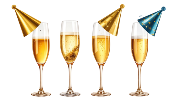 Four champagne flutes with bubbles, party hats, and golden bubbly liquid on a black background