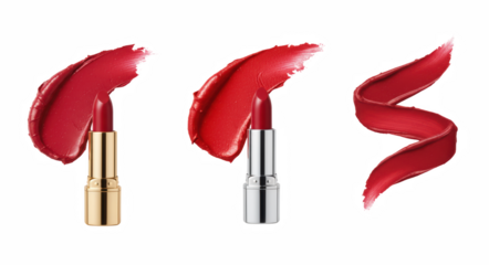 Vibrant red lipstick swatches with gold and silver tubes arranged in a clean studio beauty composition