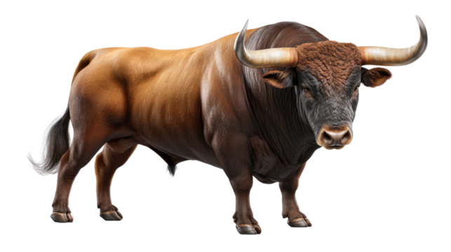 Majestic Bull's Pose: A strong bull, showcasing its powerful build and impressive horns, confidently stands ready, epitomizing raw power and determination.