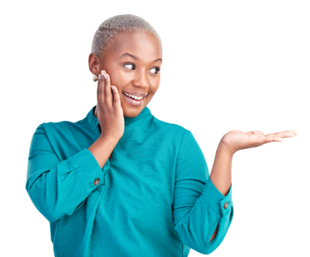 Black woman, discount or palm for presentation, offer, product or news for announcement. Transparent png background, isolated happy person or promotion with smile, beauty or sale with guide or choice