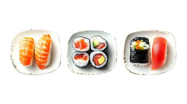 Assorted sushi pieces including nigiri and maki rolls displayed on three small square plates isolated on a transparent background for menus.