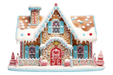Decorated Gingerbread House. On a White or Clear Surface PNG Transparent Background..