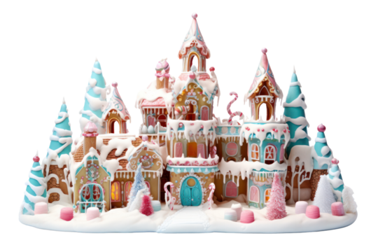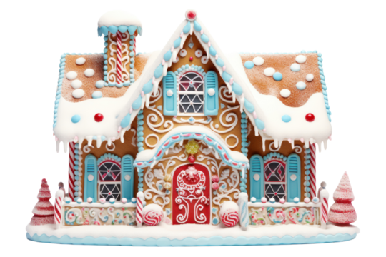 Festive gingerbread house featuring colorful candy decorations, dusted with powdery snow, floating on clear background for holiday design