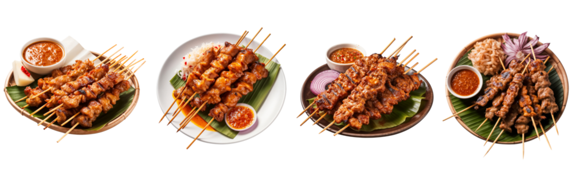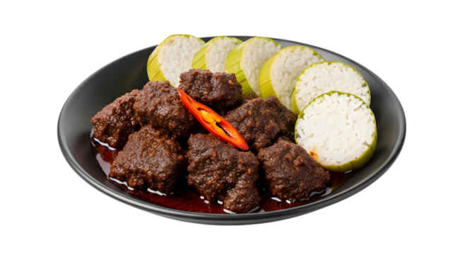 A Festive Plate of Malaysian Beef Rendang with Slices of Bamboo-Cooked Lemang Rice on isolated transparent background