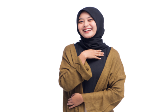 Beautiful excited Asian girl wearing hijab raising fist, celebrating success isolated on transparent background
