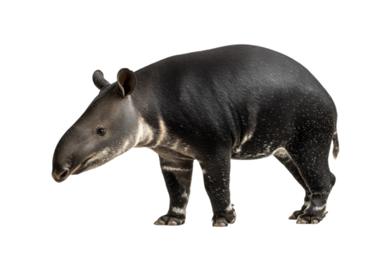 Three malayan tapirs isolated on transparent background, showcasing different life stages and coat patterns of this endangered species
