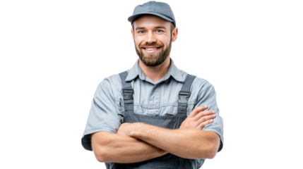 Smiling repairman in overalls with transparent background