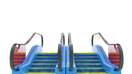 Two modern escalators with metal and glass railing isolated on transparent background for easy use in your design projects
