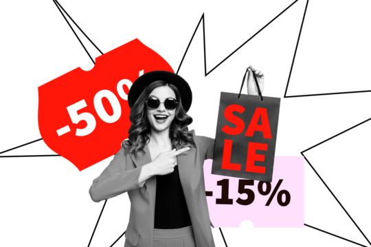 Composite trend artwork sketch image photo collage of sale black friday low price promotion buyer young lady silhouette go smile happy