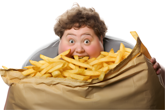 obese kid eating from a huge bag of french fries with a satisfied look. Importance of healthy eating habits, especially among childrenPoor diet concept.Png transparent background