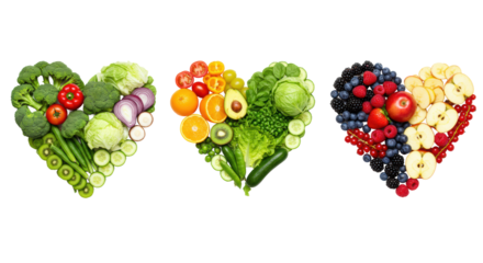 Four heart shapes of vibrant fresh vegetables and ripe fruits on a white background with copy space, dietary diversity concept