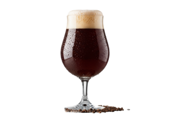 Pristine clear glass Belgian tulip filled with dark ruby-brown Belgian ale, creamy foam, subtle condensation, scattered malt grains on a shadowless transparent background, commercial beverage concept