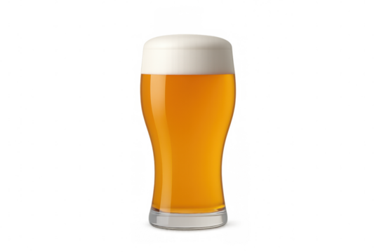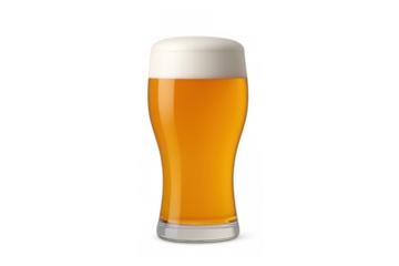 Glass containing golden malt beer with a thick white head of foam, a refreshing drink. Transparent background