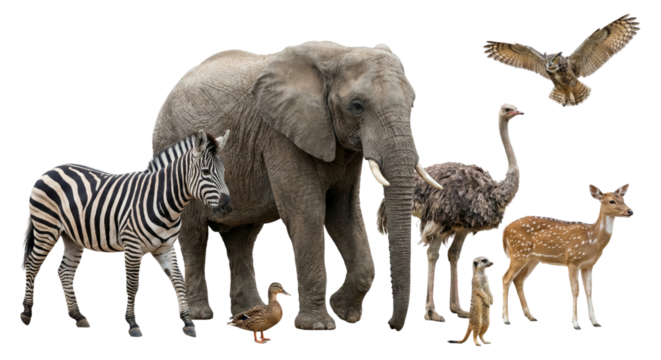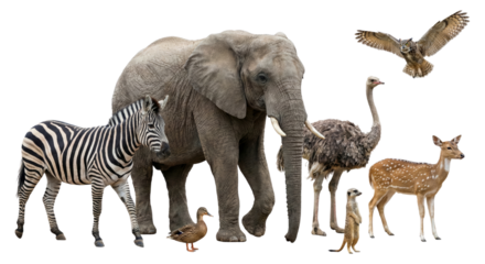 diverse group of wildlife species including zebra elephant ostrich and deer isolated on a