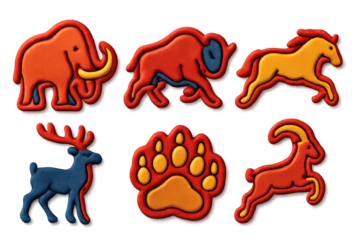 Vibrant Animal Icons. 3D icon set of animal cave figures: woolly mammoth, bison running, wild horse, deer with antlers, bear paw