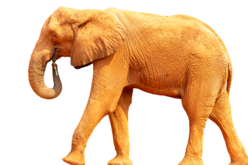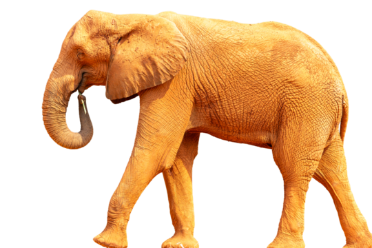 A huge African elephant with large ivory tusks and iconic ears stands isolated on a white background, showcasing the majestic nature of this wild gray pachyderm
