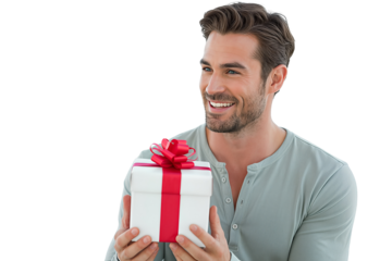 Happy young man smiling holding gift present box isolated on transparent background