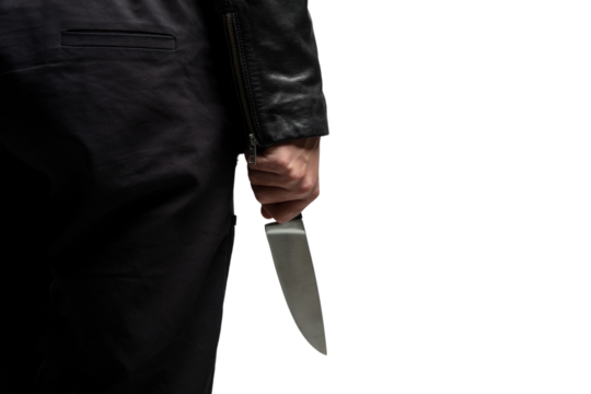 Young businessman in black suit holding a kitchen knife, killer, killer with a knife, transparent background, png file.