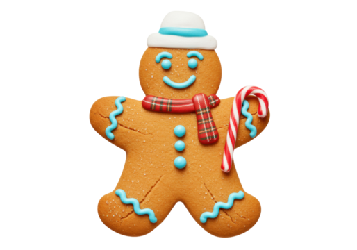 Gingerbread man cookie wearing a scarf and holding a candy cane, isolated on transparent background