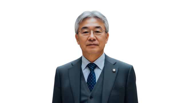 Middle aged asian man in gray suit with blue tie and glasses isolated on a transparent background male
