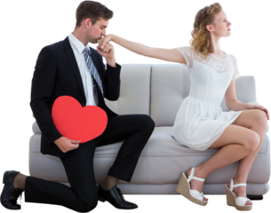 Man kneeling holding heart-shaped card transparent background