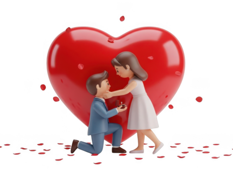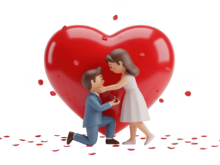 Man proposes to woman in front of heart isolated on transparent background