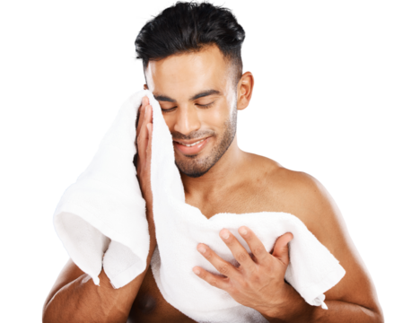 Man, skincare and towel for facial wellness, morning routine or isolated on transparent png background. Male person, face cloth and happy for clean hygiene or fresh health, shower care for grooming