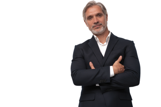Confident senior businessman with gray hair in burgundy suit posing with arms crossed professional portrait isolated on transparent background