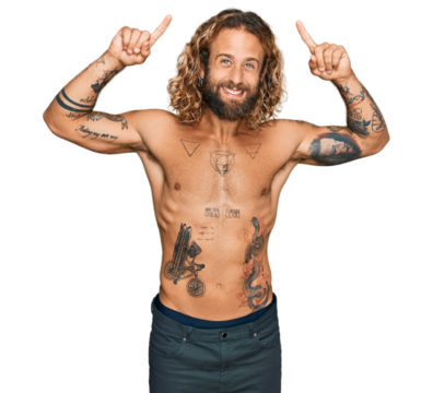 Handsome man with beard and long hair standing shirtless showing tattoos smiling amazed and surprised and pointing up with fingers and raised arms.