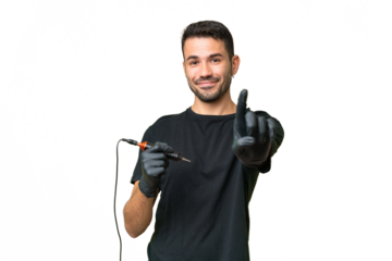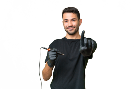 Tattoo artist man over isolated chroma key background pointing up a great idea