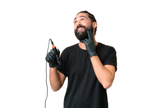 Tattoo artist caucasian man over isolated background thinking an idea while looking up