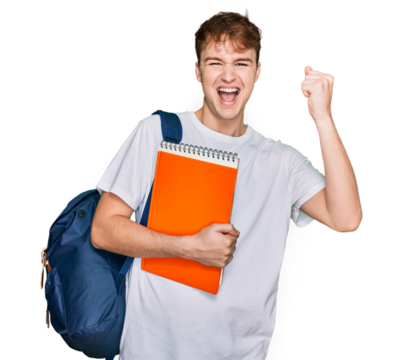 Young caucasian man wearing student backpack and holding books screaming proud, celebrating victory and success very excited with raised arms