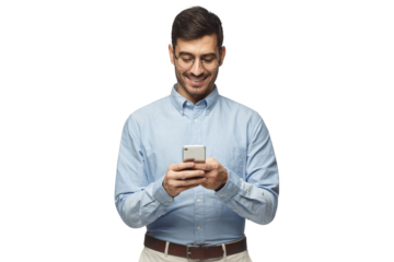 Phone, smile or happy man on social media or online for entertainment blog or texting on tech website. Isolated, transparent png background or person on mobile app to scroll for news post on internet