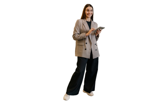 Female secretary business positive emotion uses tablet and internet in office, cut out background