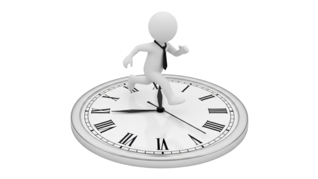 Stick figure running on a clock isolated PNG, concept of time management and deadline pressure, 3D rendering on transparent background